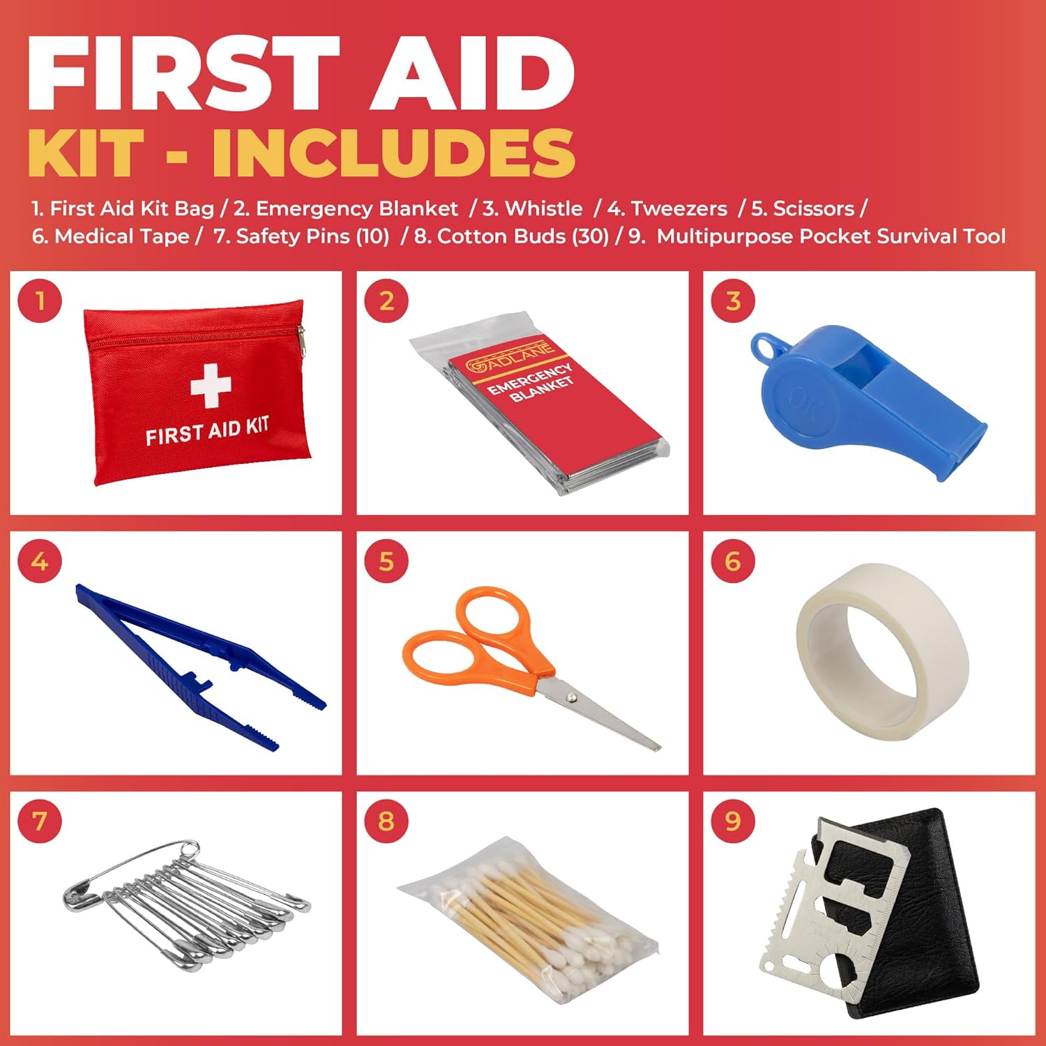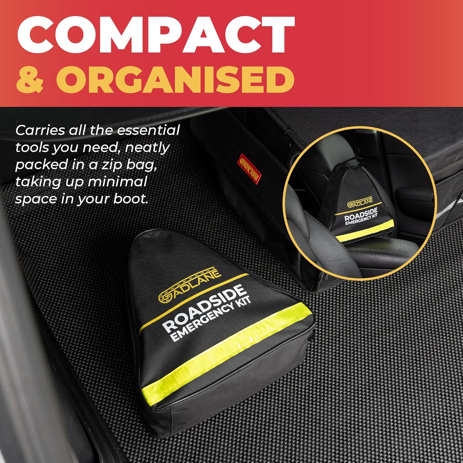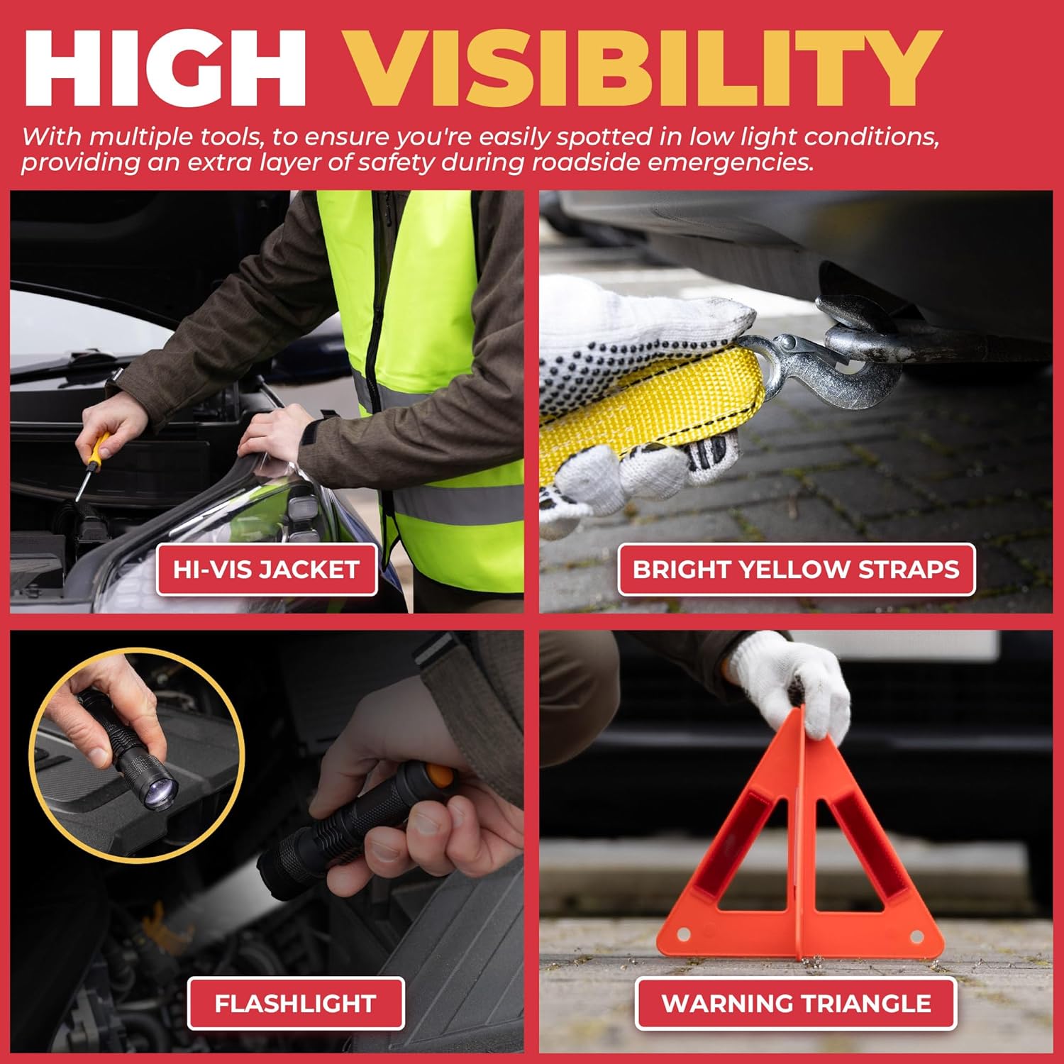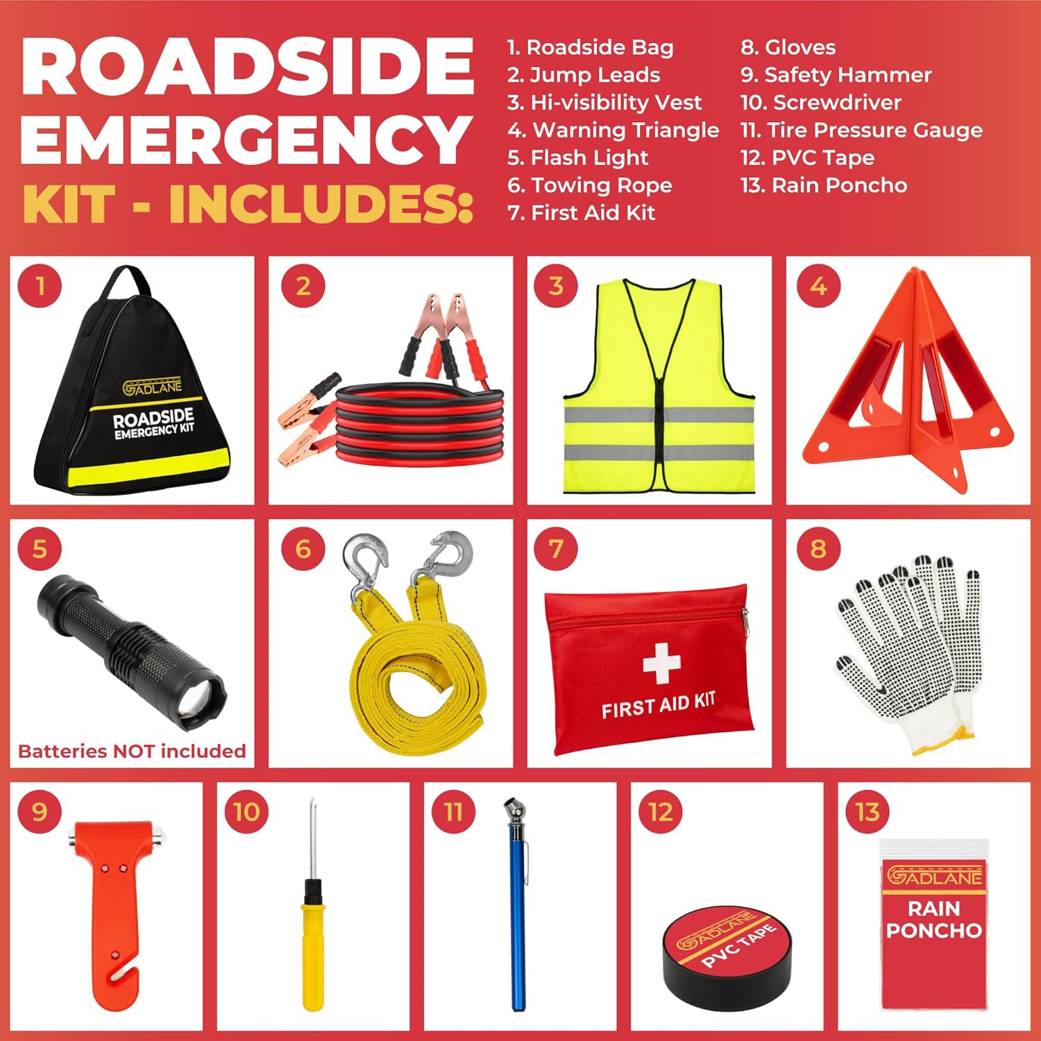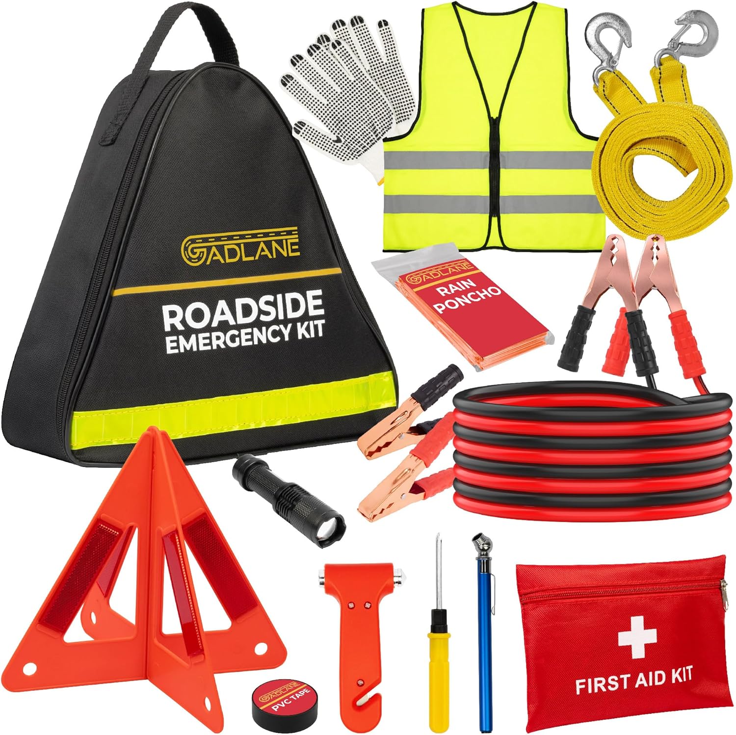 GADLANE Kit de emergencia para averías de coche, kit de emergencia grande para carretera con triángulo de advertencia, arrancadores de salto, cuerda de remolque, kit de primeros auxilios