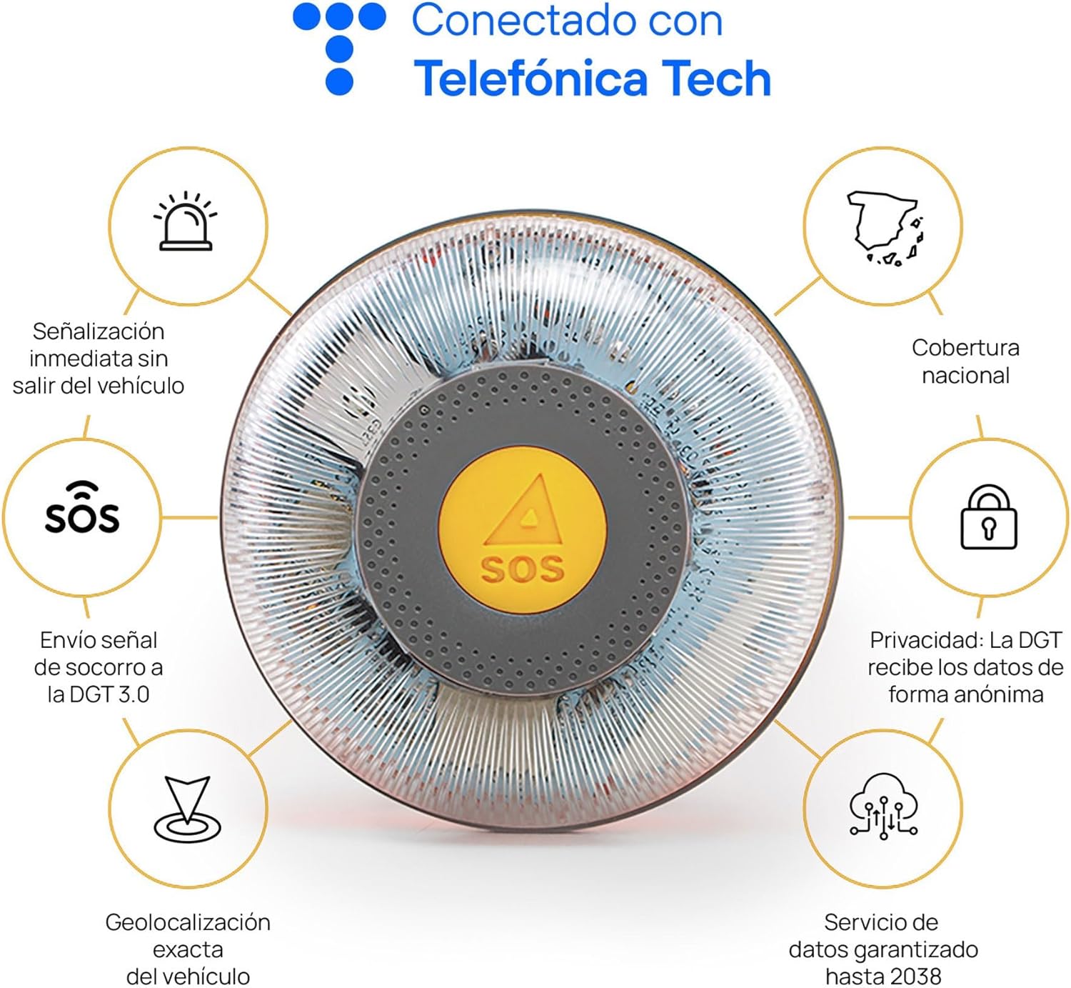 Incluye y cubre el coste de comunicaciones y servicio de datos hasta 2038, una tarjeta SIM y acceso a la red NB-IoT de Telefónica. Permite al conductor enviar alertas desde el botón SOS de la baliza, comunicando la ubicación del siniestro, incluso en áreas con baja cobertura.