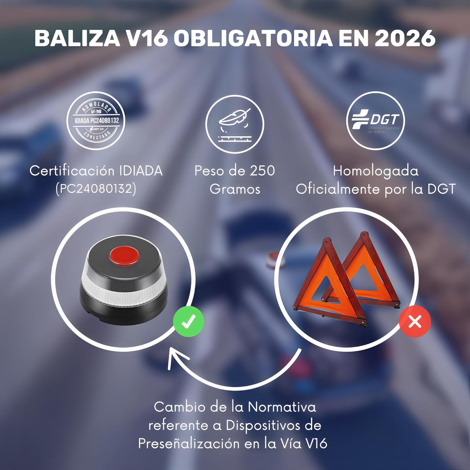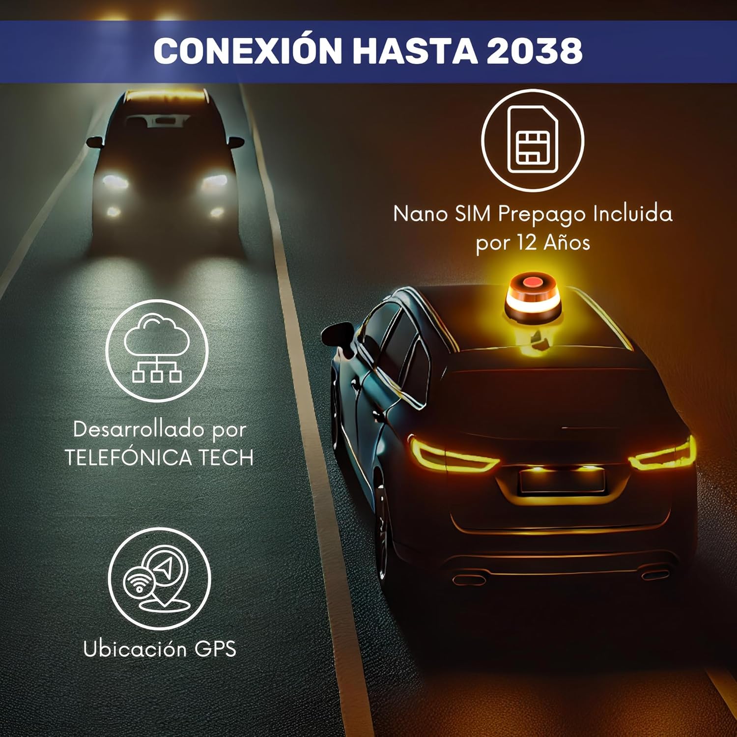 Acerca de este producto LUZ DE EMERGENCIA con GPS: Nuestra baliza V16 conectada homologada DGT combina señalización luminosa, ofreciendo visión 360 grados y alcance de 1 km, con geolocalización para mayor seguridad en las carreteras. GEOLOCALIZACION PRECISA: Comunicación segura y anónima con la DGT 3.0. Al encenderlo tu ubicación exacta se comparte de manera confidencial para tu protección en situaciones de emergencia. HOMOLOGADA DGT 2026: Reemplaza a los triángulos de emergencia cumpliendo con las regulaciones de seguridad vial exigidas por la DGT actuales y las que serán obligatorias a partir de 2026. COBERTURA GRATUITA HASTA 2038: SIM incorporada con acceso a la red V16-IoT con Telefónica Tech. Conectividad sin suscripciones ni costes adicionales. SIN SALIR DEL VEHICULO: Su base imantada permite colocar el dispositivo desde la ventanilla, eliminando riesgos innecesarios. Soporta fuertes vientos y lluvias. Utilizado también en motos.